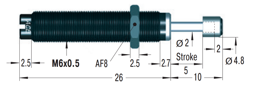 Material | Outer body, Accessories: steel corrosion-resistant coating; Piston rod: hardened stainless steel; Rod end button: steel, MC25 and MC75: elastomer insert; Locknut: steel, MC5 and MC9: aluminium |