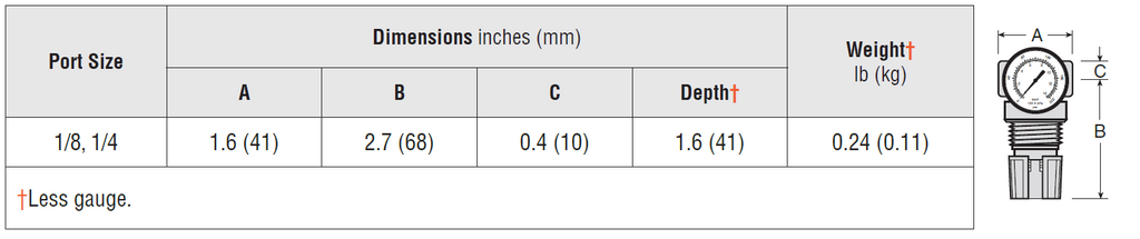 | Pressure Gauge | 0 to 160 psig (0 to 11 bar) 1/8" NPT gauge ports front and rear |