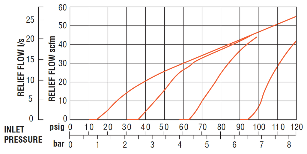 Relief valves have a maximum relief flow of 10 to 20 scfm (4.7 to 9.4 l/s). If you are looking for more sensitivity at lower pressures, please feel free to contact us for assistance.