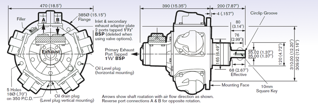 Presenting the RM510 motor, featuring a robust five-cylinder radial piston design with oil bath lubrication, offering superior power within a compact 115kg (254lbs) housing. The moment of inertia for rotating parts is 48 lb.in² / 14 gm² (motor only). Now manufactured by Globe Airmotors B.V., the RM510 originates from the old Globe Pneumatic (Fenner) models and are equivalent to the MZR17. This heavy-duty air motor delivers power up to 22kW making it one of the largest air motors we supply. Explore a range of modular options, including brake, gearbox, foot bracket and control valve, providing opportunities for enhanced customisation.