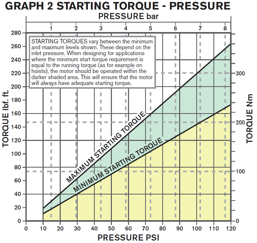 The motor's performance can be inferred from the provided performance graphs. These graphs illustrate the motor's performance in isolation, without the valve. Valves introduce minimal pressure drop, maintaining output torque while reducing motor output speed by around 10-15% at 6 bar (90 psi) under maximum power. Starting torque remains unaffected. For applications like fan drives, where motors don't start under load, either Graph 1 (Torque-Speed) or Graph 3 (Power-Speed) can be used based on the required running torque or power alone. However, for applications such as hoists, winches, or track drives, where the motor starts under load, Graph 2's starting torque must also be considered. The starting torque varies within the range shown, depending on the angular position of the output shaft.