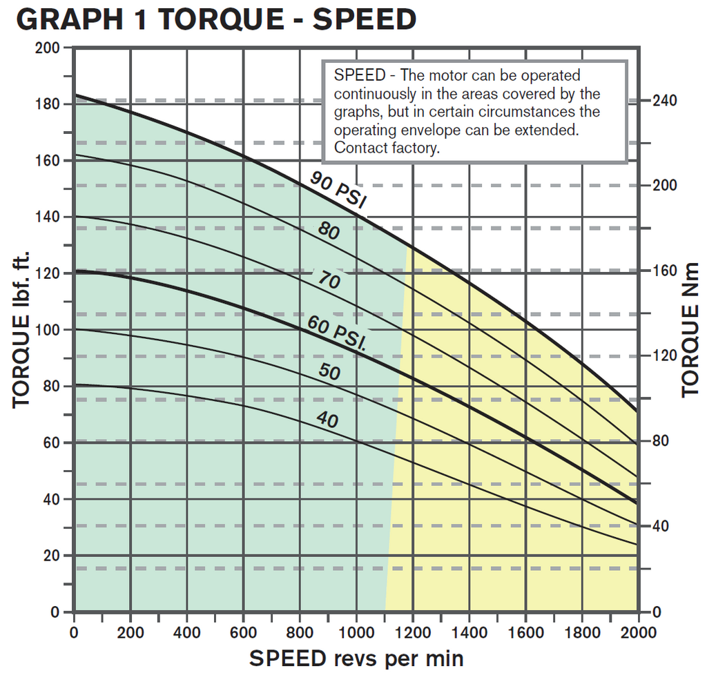 The motor's performance can be inferred from the provided performance graphs. These graphs illustrate the motor's performance in isolation, without the valve. Valves introduce minimal pressure drop, maintaining output torque while reducing motor output speed by around 10-15% at 6 bar (90 psi) under maximum power. Starting torque remains unaffected. For applications like fan drives, where motors don't start under load, either Graph 1 (Torque-Speed) or Graph 3 (Power-Speed) can be used based on the required running torque or power alone. However, for applications such as hoists, winches, or track drives, where the motor starts under load, Graph 2's starting torque must also be considered. The starting torque varies within the range shown, depending on the angular position of the output shaft.